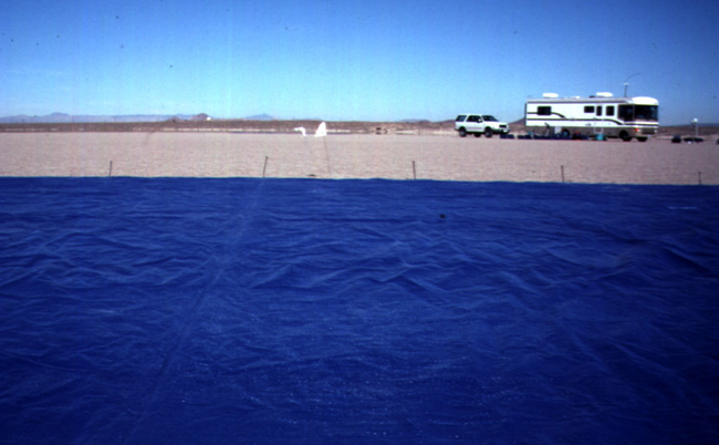 | The two tarps were set up with a series of small white flags at regular 10m intervals between them, marking off ten AirMISR pixels as projected on the ground from the 20km altitude of the ER-2. The reflectance of each pixel-sized area between the tarps was determined for later comparisons to the values of actual AirMISR image pixels. The right pixels to use are picked out from the scene by looking for the tarps (a couple of darker pixels) in the image and selecting those image pixels between them. Photo taken from southern edge of south tarp looking north. | ||